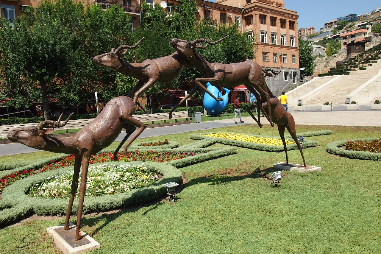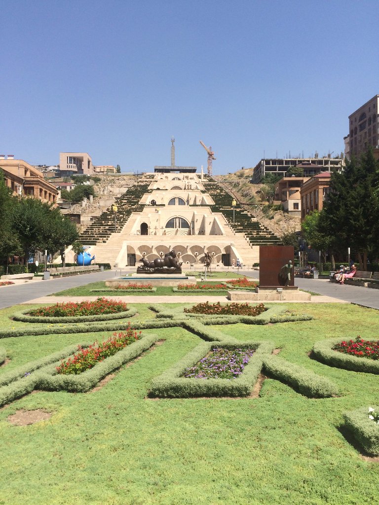 Итак, Каскад в Ереване...   Это своеобразная пирамида в виде ступеней, он словно Вавилонская башня, на самой верхушке которой установлена стелла «Возрождение Армении». Каскад очень интересный комплекс, смотришь снизу на него, вроде напоминает ступенчатый подъем к этой самой стелле, а вот начнешь преодолевать эти ступени и поймешь, что внутри каждого пролета находятся музеи, ведь Каскад – это прежде всего комплекс музейный, в стенах которого, и на стенах которого вся история возрождения Армении. Этой мыслью пропитано здесь все, фонтаны, скульптурные композиции словно рассказывают о национальном возрождении. В первом зале Каскада рассказывается об истории Армении, о создании письменности, борьбе армянского народа за независимость, художник Григор Хаджян работал над оформлением зала 14 лет и бесплатно! Остальную часть музейного комплекса занимают выставочные залы, галереи искусств, а также кафе и рестораны. Внутри Каскада функционирует эскалатор,  можно подняться наверх по нему, осмотреть все залы и экспозиции. Посмотреть тут есть на что – это и работы известных художников, таких как Марк Шагал, Аршил Горки, Энди Уорхол, и великолепные композиции и люстры из кристаллов Сваровски. Всю эту красоту подарил городу миллионер армянского происхождения Джерард Гефесчян, кроме того, он оплачивает ежедневное содержание музейного комплекса, что вызывает огромное уважение к этому человеку. Прекрасен и парк искусств у подножия Каскада, здесь представлены скульптурные композиции различных известных скульпторов с мировым именем, таких как, например, колумбиец Фернандо Ботеро и его «знойная женщина», подставляющая свои необъятные бока ереванскому солнышку, или бронзовые зайцы английского скульптора Барри Флэнагана и антилопы Сараджа Гуха. А у «истока» этого великолепного парка установлена скульптура А. Таманяну, первому архитектору Еревана, который и спроектировал красивейший город. Ну, а если подниматься по Каскаду по верху, по ступенькам, вас ждет не менее захватывающее зрелище – центр города как на ладони. Слева и справа от ступеней разбиты прекрасные клумбы, они делают подъем на самый верх Каскада приятным, ну а если устали, всегда можно передохнуть на лавочке у фонтанов, которые так и дышат прохладой. В самом верху Каскада с левой стороны, здание Центра Ш.Азнавура, сейчас здесь заканчивается отделка, где будут проходить концерты.
