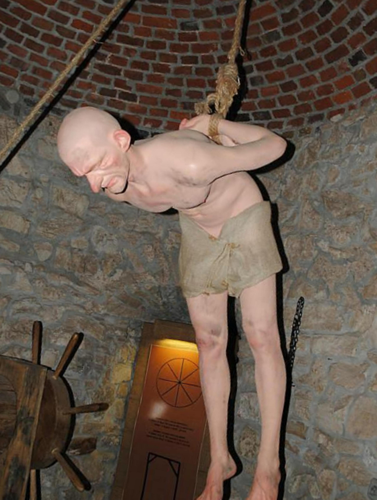 Выглядит довольно реалистично еще и потому, что вдоль тюремных камер ходит самый реальный палач, у которого в руках большой кнут и маска на голове. Вполне реально выглядит он, скажу я вам.