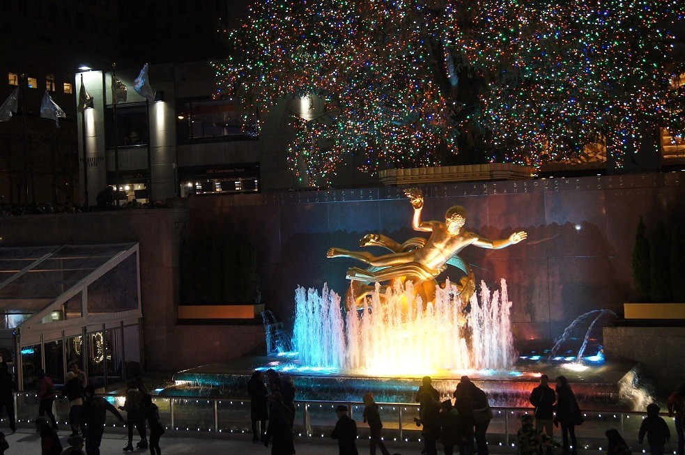 Это Фонтан Прометей у входа в центр. Греческий бог выполнен из золотой бронзы, установлен в 1930 году, он символизирует жизненные силы и удачу. Фонтан является как бы символом Нью-Йорка, каждый приезжающий сюда турист хочет сделать здесь фото. А если вам, как мне, посчастливится оказаться в Нью-Йорке в канун Рождества вы увидите еще и одну из главных Рождественских елок страны, она находится прямо над фонтаном и просто великолепна! Кстати, звезда на елке выполнена из кристаллов Сваровски.