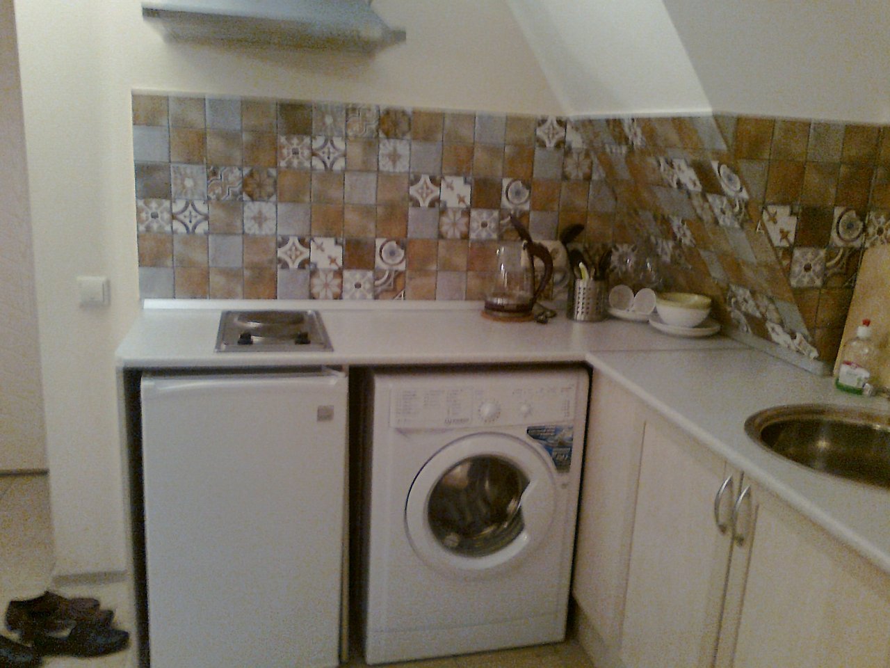 Об апартаментах. Это квартира-студия с кухней (столовые приборы, бокалы, сковородки, микроволновка, электрический чайник, плитка, холодильник и пр.), стиральная машина, телевизор, мебель (кровать, комод), хороший санузел.