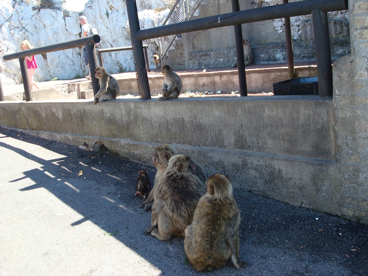На Гибралтарской скале полно обезьян. Их изображение есть на многих сувенирах, они там как талисман: если обезьяны уйдут с Гибралтара, он перестанет принадлежать Великобритании. В город они вроде не спускаются, но наверху они во многих местах. Есть скопления, например, на площадке фуникулера. Ведут себя нагло. Видела, как они облепили автомобиль. У меня была книга в пакете, так одна обезьяна её выхватила, пока я фотографировала. Книгу отобрала, а с пакетом она ускакала и издалека наблюдала. Так что будьте там осторожнее, кормить их нельзя, да и незачем.