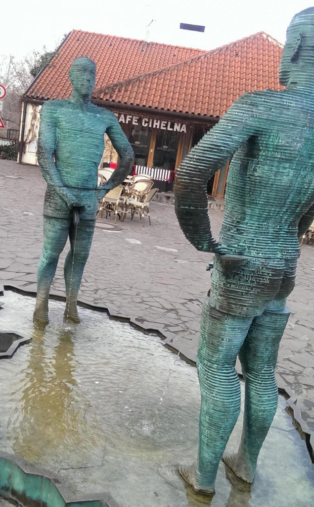 Во дворе музея есть необыкновенный фонтан. Автором этого творения является эпатажный чешский творец Давид Черный, который также известен по гигантским младенцам на телебашне, перевернутом коне и розовом танке. Фонтан состоит из мелкого бассейна, который напоминает по форме Чехию. В этот музей две статуи мужчин справляют нужду. Они не просто писают, а выписывают фразы и слова, которые отправляют все желающие на специальный номер. Не знаю, хотела бы я, чтобы мне что-то они выписали