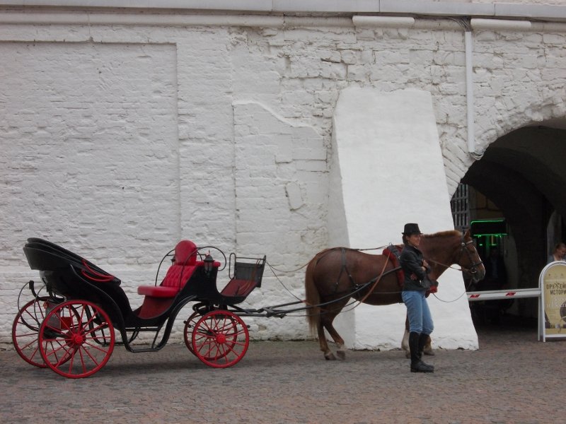 Тех, кто переоценил свои силы и притомился карабкаться на кремлевский холм, сразу у входа поджидают экскурсионные конные повозки. Ухоженные лошадки, улыбчивые возницы в пижонских шляпах, стилизованные под старину полуоткрытые повозки на несколько человек (если правильно помню, такая конструкция называется "коляска", более закрытая версия будет "карета", как на улице Баумана стоит для фотосессий). Народ активно катается и внутри Кремля, и снаружи по улице Кремлевской от Кремля до Университета.