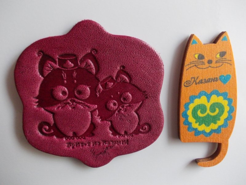 Магнитик слева - кошачья парочка в национальных татарских шапочках-тюбетейках, тиснение по натуральной коже.