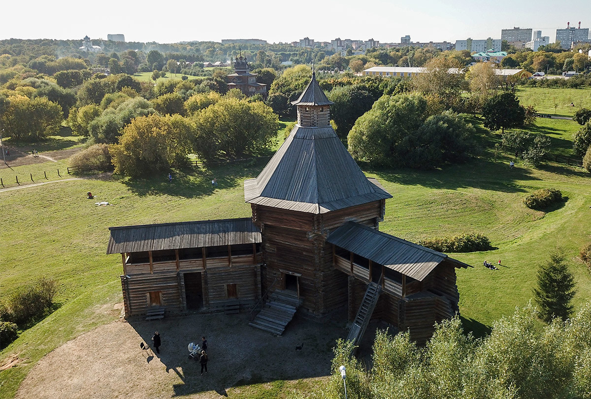 Упомянутые выше строения обозначены на снимке соответствующими надписями и стрелками. Монастырские ворота, как и башня острога, являются отдельными самостоятельными экспонатами, продолжение стен обеих погибло от пожаров еще на прежнем месте расположения, на севере России. В Коломенском они входят в состав экспозиции русской деревянной архитектуры. Подмосковье обрело собственное собрание, продолжающее традиции Кижей, Костромы и Витославлицы.