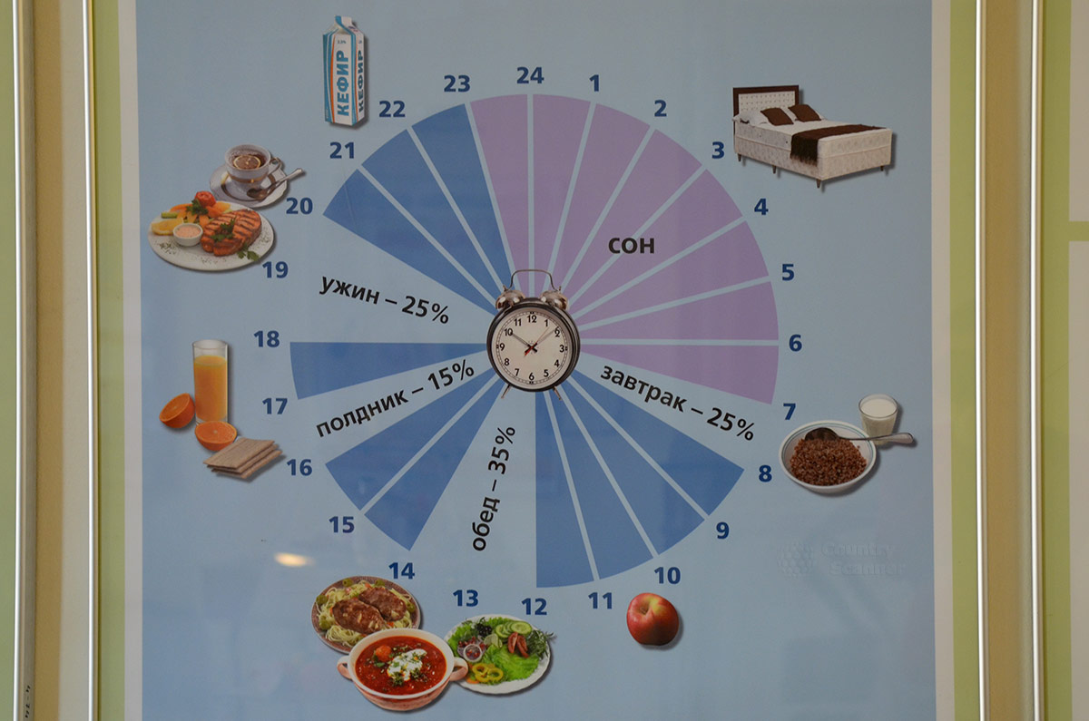 Указанные промежутки приема пищи на плакате с типовым распорядком дня среднестатистического человека – рекомендуемые для полностью здоровых людей, при отклонениях здоровья и тем более больным людям нужна врачебная корректировка, которую может дать только лечащий врач.