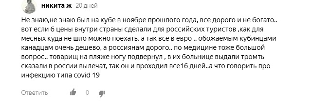Авиационное сообщение с Кубой восстановилось недавно. Если кубинские чиновники и уверяют, что отдыхать в их стране безопасно и комфортно, то россияне думают иначе. Об этом свидетельствуют комментарии наших читателей на канале Яндекс Дзен. Как только прибыл первых рейс из России на Кубу, туристы в соцсетях сообщили, что обслуживание на высшем уровне. Радость была недолгой — последовала информация о выявлении коронавируса среди путешественников. Как оказалось, вера в кубинскую медицину у россиян отсутствует напрочь.