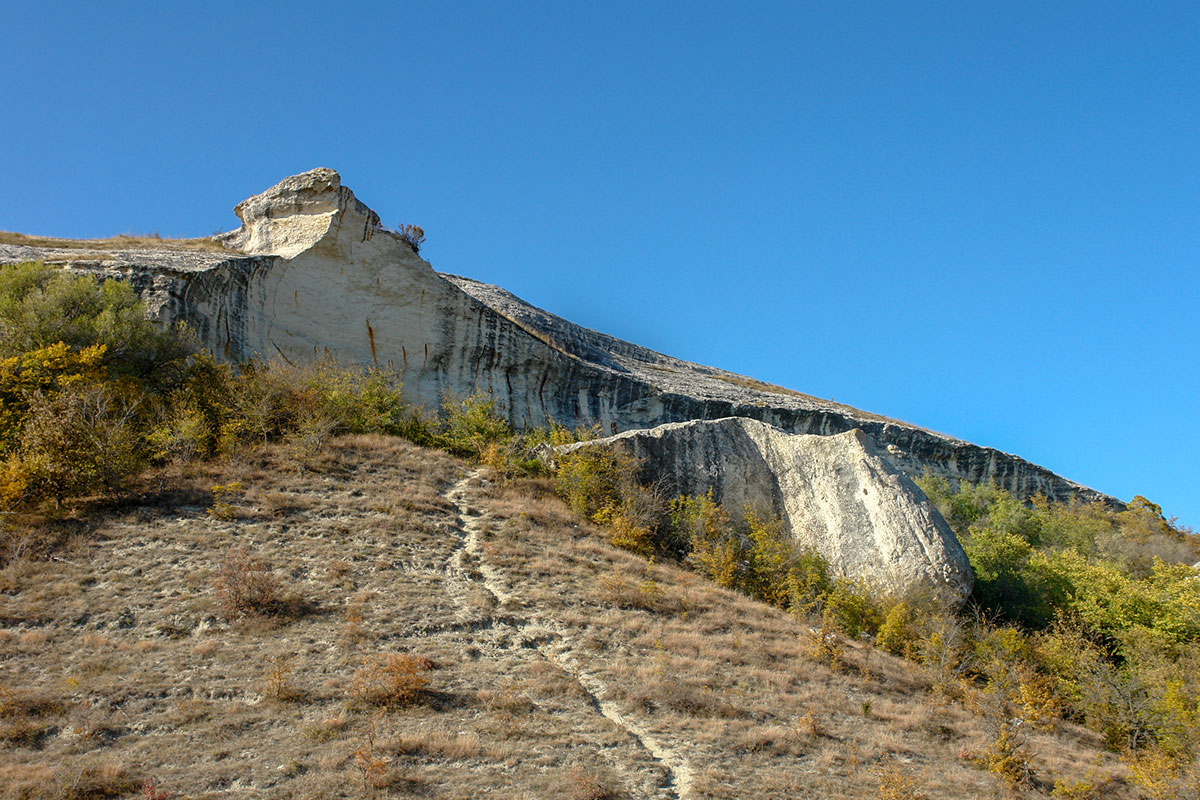 Здесь уже начинается непосредственно территория древнего поселения. Необходимо упомянуть, что термин «пещерный город» весьма условный. Вопреки распространенному заблуждению, высеченные в скале помещения крайне редко использовались в качестве жилья. Население обитало в наземных домах. Каждая семья имела собственную отдельную усадьбу. Территория усадьбы была огорожена глухой каменной стеной с одним входом, за которой располагался крошечный двор и, как правило, двухэтажный дом. Нижний этаж дома возводился из бутового камня, стены часто обмазывались глиной или штукатурились. Здесь находились хозяйственные помещения, кладовые, содержался домашний скот. Жилым был второй этаж, представлявший собой более легкую деревянную конструкцию. Крыша покрывалась керамической черепицей из красной глины. Ее обломки всегда попадаются под ногами во время прогулки по любому «пещерному городу». В некоторых усадьбах имелись и подвальные помещения. Камень для строительства добывался в окрестных скалах, а образовавшиеся полости – пещеры, приспосабливались для хозяйственных, культовых и военных целей. После гибели городов наземные постройки разрушились довольно быстро. Еще на протяжении нескольких столетий местное население использовало строительный камень из их руин для собственных нужд. Пещеры же сохранились достаточно хорошо, отсюда и происходит термин «пещерные города».