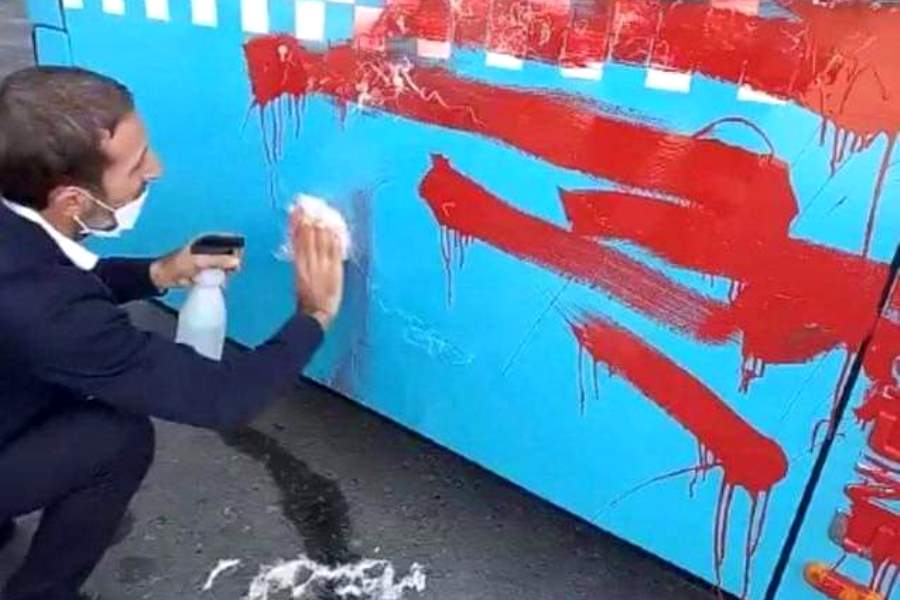Естественно, перед отправкой на маршрут пришлось вытирать краску из автобуса, так как внешний вид у него был непрезентабельный.