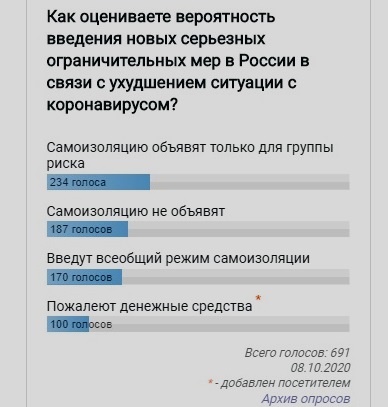 В связи с недавними заявлениями чиновников мы решили опросить наших читателей на тему введения жестких ограничений в России. Приближаются новогодние праздники, а настроение стабильно ухудшается. Нужно также понимать, что заявление по поводу отказа от новогодних путешествий носит рекомендательный характер. По закону рекомендация не может ни к чему обязывать. Ниже вы можете увидеть результаты опроса, в котором принял участие 691 наш читатель.Большинство считает, что самоизоляцию могут ввести только для группы риска. Это означает, что туристы не рассчитывают на дальнейшее ухудшение ситуации и запрет путешествовать на законодательном уровне. По крайней мере, это касается внутреннего туризма. Карантин в России вряд ли будет общенациональным. В этом случае экономика понесет серьезные убытки.