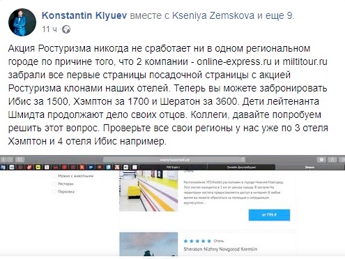 TourDom обратился к автору поста за комментариями. По его словам, подобные тарифы могут публиковаться только для привлечения внимания потенциальных гостей. Реальную цену можно увидеть только перейдя по указанной ссылке. Причем в большинстве случаев цена отличается от изначально анонсированной. Для примера можно взять Hampton в Нижнем Новгороде. Согласно рекламе, номер можно забронировать за 1700 руб. Но по действующей акции этот отель предлагают забронировать за 7000 рублей (две ночи).Эксперт считает, что в этой ситуации можно смело говорить о недобросовестной конкуренции. Клиентов абсолютно сознательно вводят в заблуждение. Остается непонятным, почему Ростуризм позволяет действовать таким образом. Чтобы подключиться к данной программе отели потратили немалые средства. Но, появилось четкое ощущение, что эти средства не окупятся. Участников обсуждения удивляет не только факт занижения стоимости. Смущает право туроператоров предлагать как пакетные предложения, так и отдельно размещение. Во вкладке «Отели» обозначаются в основном туроператоры, сообщает гендиректор инвестиционной компании «Индиго Девелопмент».