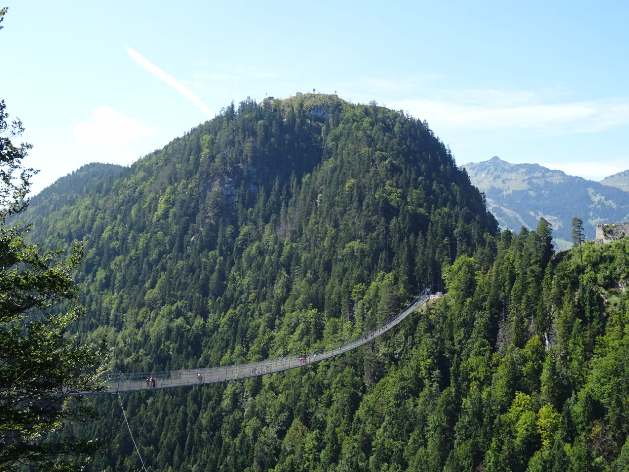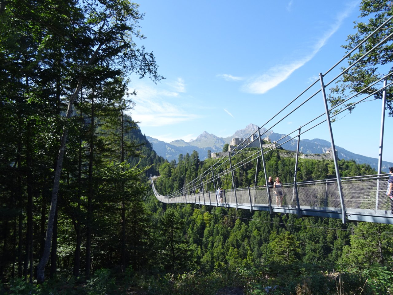 Недавно получилось пройти по подвесному мосту в Австрии. Туда пока ездит не очень много туристов, потому что место не очень разрекламированное. Впечатления прекрасные. Мост протянут между замками, внизу дорога, когда идёшь, он немного колеблется. Видела, как собака упёрлась у входа и отказывалась идти по нему. Обратно можно просто пешком спуститься с горы или снова идти по мосту. Когда сильный ветер, мост закрывают. Место называется Reutte.