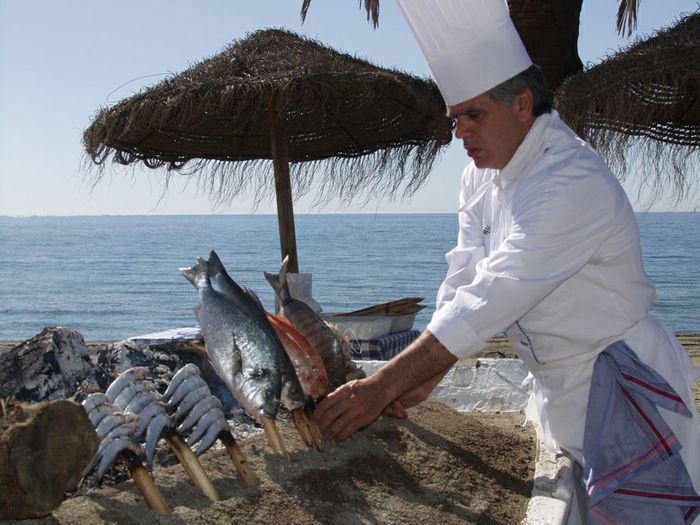 ну если говорить не только о Барселоне, а в целом об Испании, тогда обязательно надо рыбу гриль попробовать. Знаете, там есть такой вариант приготовления необыкновенный. Когда на пляже стоят лодки с песком, а на них готовят рыбу. Рыба не на самом песке, а на палочках и углях. Выходит очень вкусно и необыкновенно. ну и посмотреть на такой способ приготовления тоже интересно.Вот как-то так это все выглядит.А что "аутентичной" испанской кухни посоветуете попробовать? Или ещё лучше - специфической каталонской. Чего в России не купишь. В том числе, интересуют блюда без мяса, так как моя любимая мясо не ест. Но мы очень любим рыбу