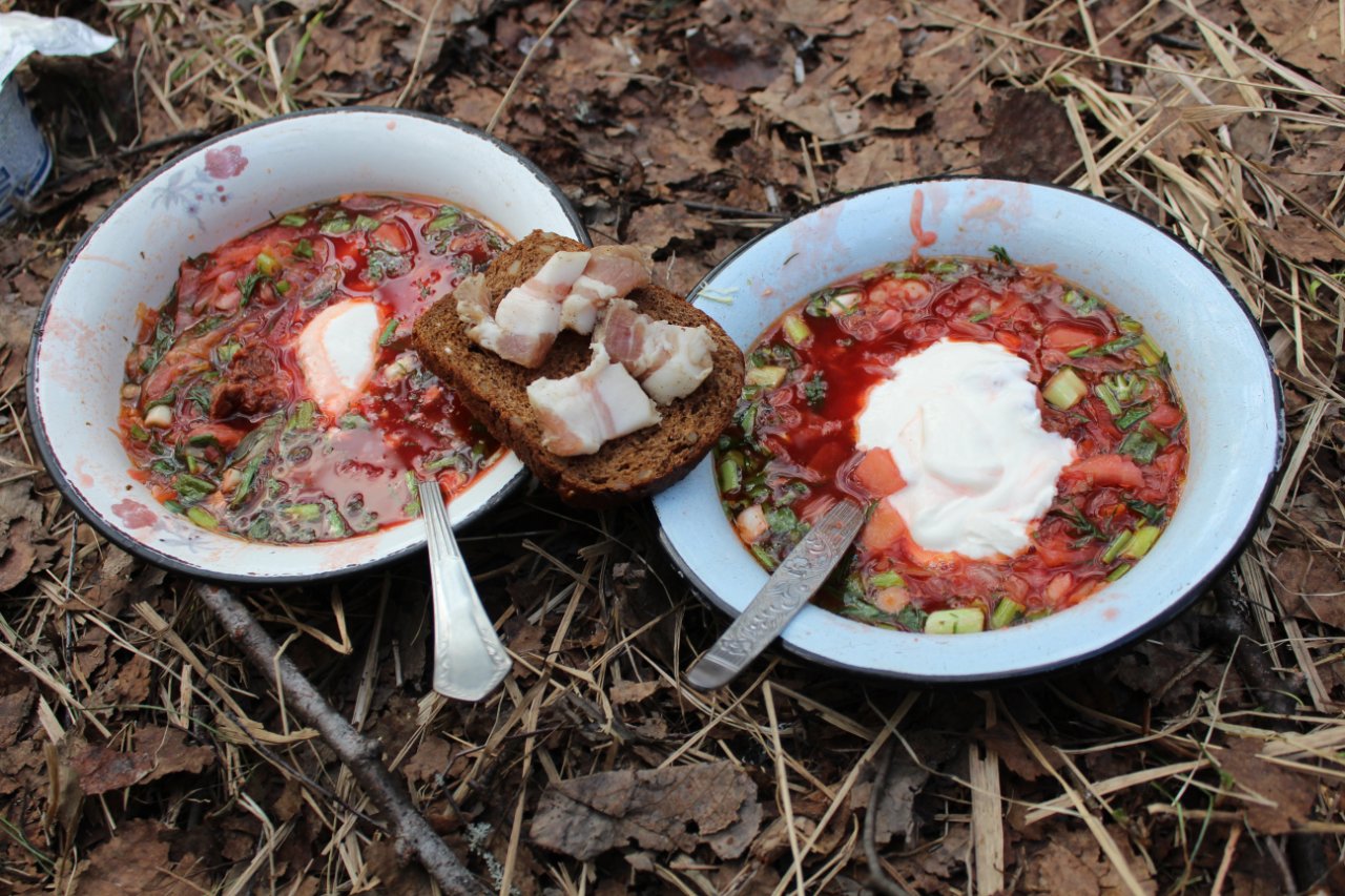 Прочитала про борщ и вспомнила, как мы будучи детьми без всяких походов на поляне разводили костер и готовили суп из того, что нашли дома. Ох и вкусно же было! Хотя для нас тогда и выход в поле уже был походом)Обычно идем в поход дней на пять - десять. Продумываем меню и закупаем продукты все вместе. Потом распределяем по рюкзакам поровну. Так гораздо удобнее: лишних продуктов не остается, меню разнообразнее, рюкзаки - легче. Особенно, когда компания большая. Готовим же все равно в одном котле. Вкуснее борща на костре ничего в жизни не ела...