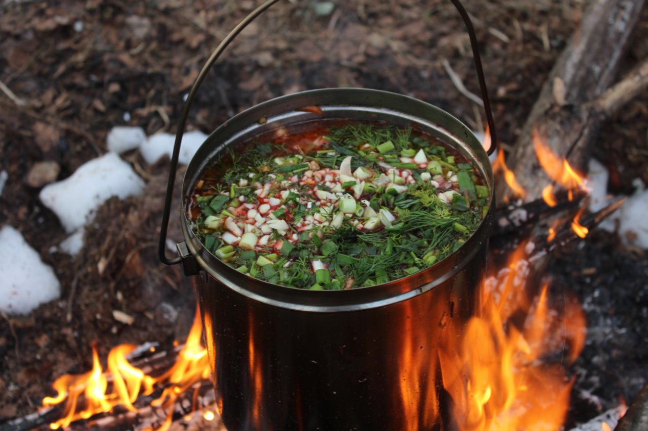 Приготовлением пищи на костре занимаюсь всегда я, как и дома. Люблю побаловать своих мальчишек вкусненьким. Последний раз готовила картофель с беконом в фольге. Конечно, нести приходится продукты моим мужчинам, но они совсем не против. Так как знают, что мама вкусно накормит. Всегда берём собой яйцо, овощи, бутерброды и обязательно зелень, а напоследок, оставляем кашу с мясом в консервах, когда съедаются запасы, баночка такой каши очень кстати припасённая, добавит жизненной силы и энергии на обратную дорогу.Без полевой кухни поход не удастся. Туристам нужно пополнять жизненную энергию, которую они тратят на протяжении дня во время переходов по местности. В походе больше всего ценится питательная и полезная еда. Калорийные каши готовятся утром, чтобы набраться сил перед выходом. Кашку приправляют консервами, салом. На первое время хлеб можно взять свежий, но в дальнейшем в рацион будут использоваться сухари. Они заготавливаются в домашних условиях, до похода. Во время большого привала группа делает себе бутерброды, кушает сухофрукты, конфеты. При желании можно сообразить горячий обед с легкой кашей. Вечером готовится суп. Заготовки желательно сделать дома. Капуста, свёкла, перец, лук, морковь, все это сушится на солнце или в духовке. Таким образом вес уменьшается, что очень помогает туристу. И конечно же чай, или любой горячий напиток на выбор.