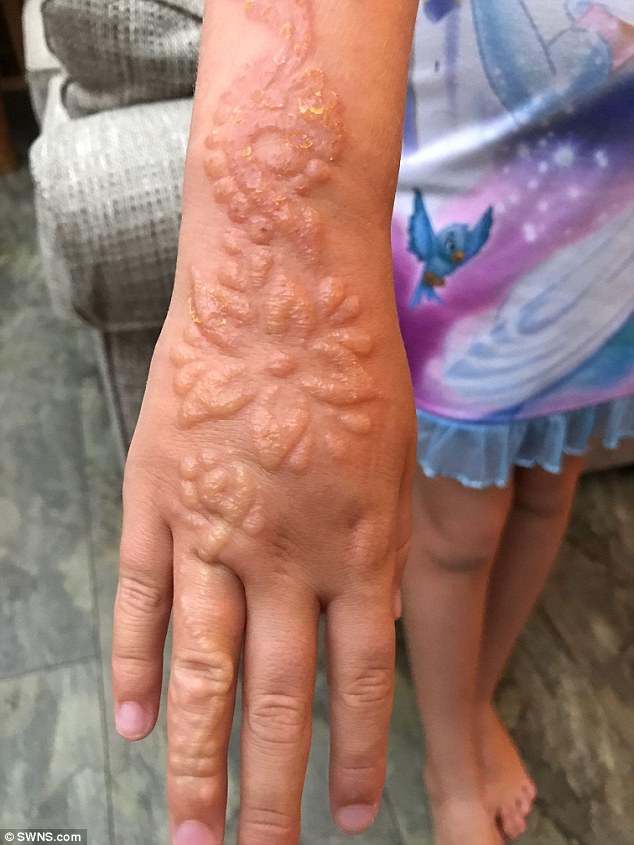 На днях с  7 летней английской девочкой, отдыхавшей в Хургаде, произошла самая настоящая трагедия. Как и многих деткам, ей захотелось сделать себе красивый рисунок на ручке. Несмотря на то, что старший брат уже почувствовал жжение и потребовал сразу смыть свой рисунок, она мужественно дотерпела до конца.Но ситуация развивалась все хуже и хуже. И итоге под татуировкой образовался самый настоящий ожог. Сейчас Медисон проходил лечение в одной из английских клиник, но врачи до сих пор не могут дать гарантию, не останутся ли на ее ручах страшные шрамы. А какую боль ипытывает несчастный ребенок, даже трудно себе представить. Возможо, дело было в индивидуальной непереносимости, а вредных веществ в составе и не было. Никто не знает.