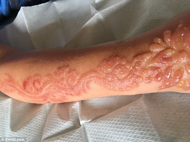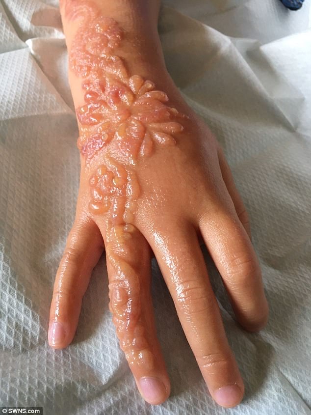 На днях с  7 летней английской девочкой, отдыхавшей в Хургаде, произошла самая настоящая трагедия. Как и многих деткам, ей захотелось сделать себе красивый рисунок на ручке. Несмотря на то, что старший брат уже почувствовал жжение и потребовал сразу смыть свой рисунок, она мужественно дотерпела до конца.Но ситуация развивалась все хуже и хуже. И итоге под татуировкой образовался самый настоящий ожог. Сейчас Медисон проходил лечение в одной из английских клиник, но врачи до сих пор не могут дать гарантию, не останутся ли на ее ручах страшные шрамы. А какую боль ипытывает несчастный ребенок, даже трудно себе представить. Возможо, дело было в индивидуальной непереносимости, а вредных веществ в составе и не было. Никто не знает.
