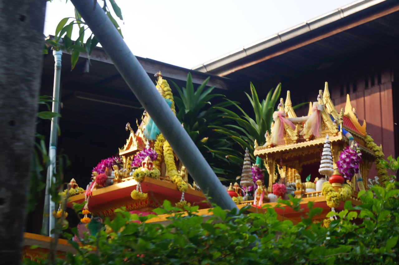 Но по дороге нам встречались и страшные старые домики, которые можно было бы принять за хлам, но в них стояла кола и темные угощения. Оказывается, на свалках, на берегах каналов и в прочих не очень чистых местах живут плохие духи. Вот им и отдают старые домики, а еще ставят плохое угощение. Странно, конечно. Наверное, это тайцы не смотрели мультик про "Простоквашино", где Печкин объясняет, что он злым был, потому что у него велосипеда не было. Возможно, если бы злых духов стали угощать вкусными сладостями, они тоже были бы не такими злыми.