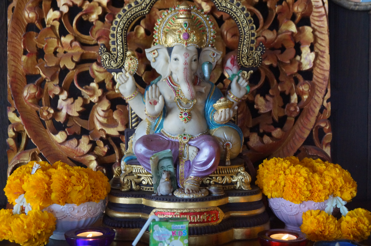 А еще везде стоят святилища бога - слоника Ганеши. Ему тайцы тоже поклоняются и приносят разнообразные дары. Хотя жители Таиланда - буддисты, а Ганеша - индуистское божество. Но как же не помолиться Ганеше, ведь он дарует ум, а, самое главное, деньги и успех в бизнесе.