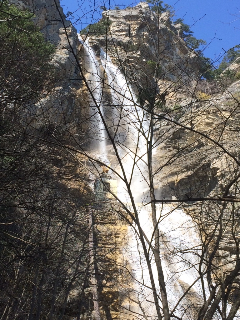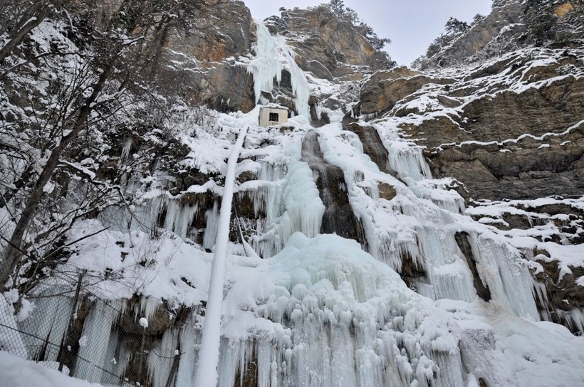 Высота водопада 98 метров. На пути "летящей воды" образуется 2 каскада, на верхнем из которых стоит бетонное сооружение с орлом вверху. Вообще, эта постройка является водозаборной и от нее по трубе идет вода к водохранилищу Могаби. Да, труба конечно не самым лучшим образом вписывается в картинку, но что же поделаешь, не мне решать, чему где быть. Наверное, иногда нужно уметь выбрасывать из кадра ненужное, как вот эту трубу. Я на нее старалась просто не смотреть и фотографии делать так, чтобы ее меньше всего было видно. Это трудно, потому что она находится на хорошо просматриваемом месте, как раз в центре. Зимой иногда дорога к самому водопаду закрыта, но можно оставить машину и пройтись немного пешком. Еще один момент, чтобы увидеть водопад во всей красе, нужно знать, когда именно туда ехать. Вот так он будет выглядеть зимой.