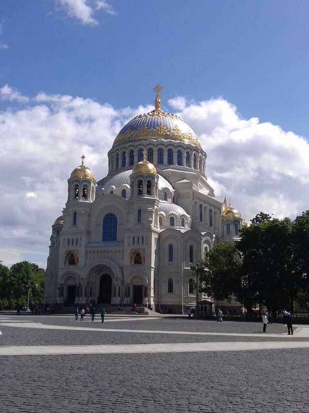 Каждыйкто бывал в Кронштадтевидел этот Соборон находится на Якорной площадив окружении зелени парковЭто последний построенный в Российской империи морской Соборего возвели по приказу последнего русского императора Николая II в 1903-1913 г.гархитектором В.КосяковымЕго белоснежные стены и бирюзовый купол запомнится вам своей величественностьюСобор всем своим видом словно говорит о своей принадлежности к морюфлоту - его облик напоминает парадную офицерскую морскую формуон такой же нарядныйно строгийК тому же Никольский является главным морским собором РоссииСобор закладывался в память о погибших при исполнении служебных обязанностей морских офицерахпоэтому в Соборе установлена мраморная плитана которой выбиты фамилии погибшихОчень красив Собор внутристены его выполнены из светлого мрамораа купольная часть и алтарь расписаны в византийском стилеАлтарная часть приподнята над остальной частью собора на 4 метратакое я увидела впервыеДолгое время храм стоял в запустении и начал разрушатьсяпока в 2002 году Патриарх Всея Руси Алексий II не благословил его возрождениеИ вотв мае 2013 годасостоялось его торжественное освящениеТеперь здеськроме богослуженийпроходят и торжественные выпуски курсантов военных морских училищПосмотритекак прекрасен Главный морской Собор нашей страны!!