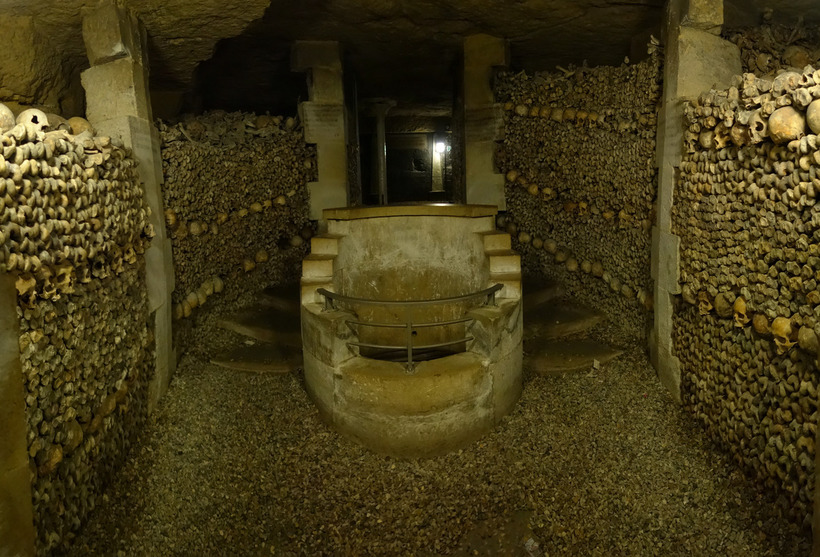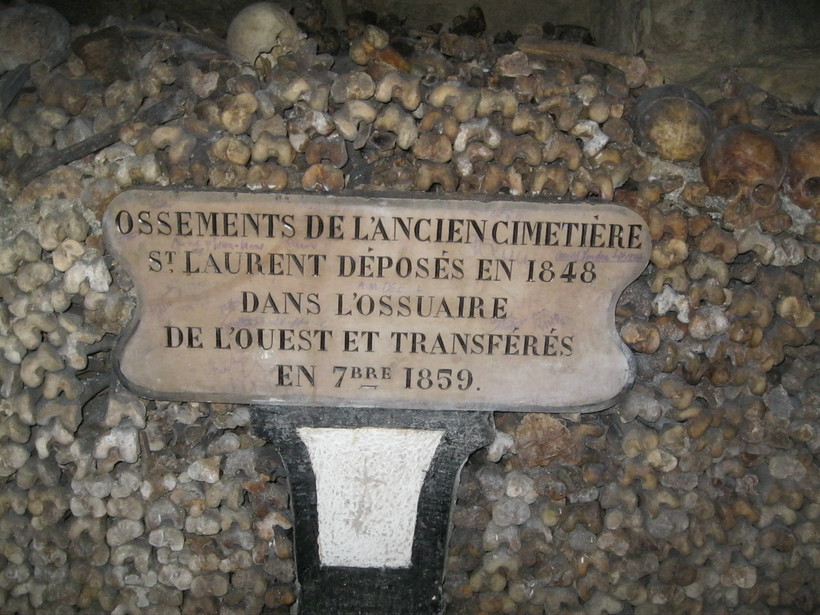 Посещение Катакомб начинается того, что вы попадаете в Музей катакомб, в котором можно посмотреть фотографии некоторых моментов на каменоломнях. Раньше ведь здесь добывали горную породу для потребностей города. И кстати, в период, когда активно работали каменоломни, они находились за чертой города. Это уже сейчас город стал гораздо больших размеров, потому и каменоломни попали в черту города. Так как внутри находятся останки давно умерших людей, само собой появляется вопрос, каким образом они туда попали. Так вот, столица же не могла быть маленьким городом, потому и появлялось на ее территории много кладбищ. Среди всего того количества находится и кладбище Невинных мучеников. Сначала оно не было таким большим, но после того, как прошла эпидемия бубонной чумы, а потом Великая французская революция, то к концу 18 века здесь оказалось больше 2 млн. мертвых. А потом и вовсе места не стало и начали хоронить людей одного поверх другого. находили какое-то старое захоронение и поверх еще одного хоронили. От этого на кладбище витала жуткая вонь, которую было слышно за версту. А где вонь, там и инфекции, с которыми нужно было как-то бороться. А бороться нужно было церкви, потому что она брала деньги за захоронения. Кому же захочется терять очень даже неплохой доход? Думаю, никому. Но тем не менее, такое решение оттягивалось. ну и дооттягивались до того, что стена между жилым кварталом и кладбищем просто рухнула и все останки с нечистотами рассыпались во двор. Тогда то и приняли решение, что останки людей нужно куда-то перемещать. Лучшего места, чем каменоломни просто не смогли найти. Вот таким образом они там и оказались. После того решили, что в черте города больше не должно быть никаких захоронений.