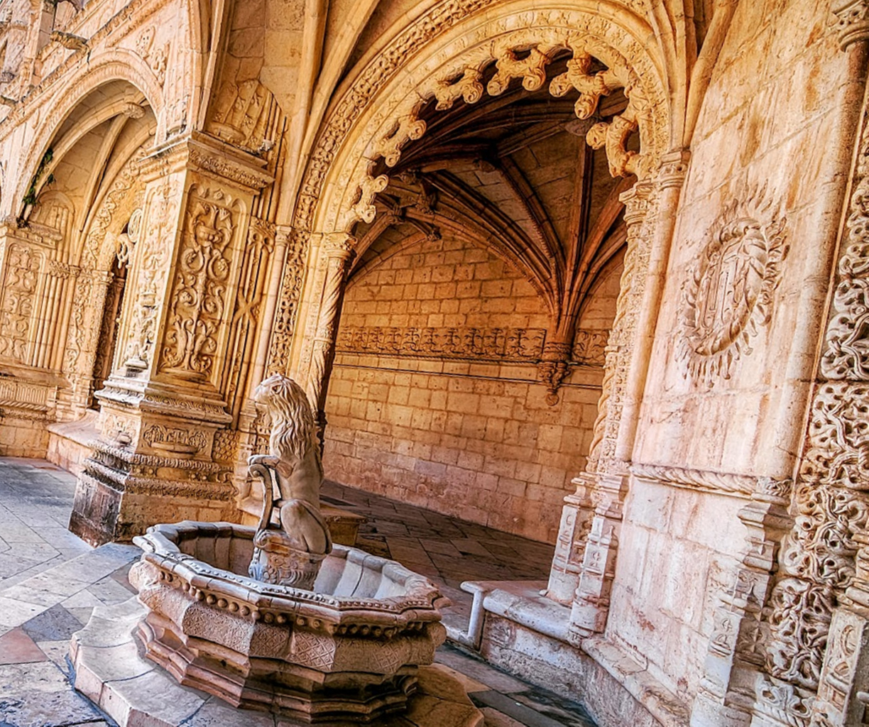 Наиболее привлекательное место спрятано от людских глаз и находится во внутреннем дворе. Это крытая галерея и зеленый дворик с фонтаном. Здесь монахи отдыхали, читали и думали о чем-то своем. Снаружи галерея не кажется такой величественной, но внутри можно увидеть высокие потолки и все тот же морской стиль. Очень красивая внутренняя отделка галереи просто завораживает.