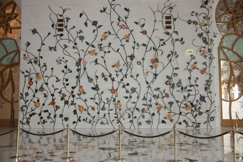 Действительно, очень красивая мечеть. При её строительстве были использованы самые дорогие материалы. Мрамор привезен из Италии. Пол, стены и столбы украшены полудрагоценными минералами,  которые по особой технологии вставляются в мраморные плиты и образуют удивительные узоры.